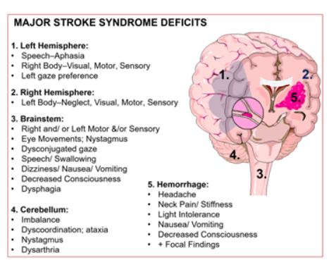 Posterior circulation strokes present differently and are commonly missed by most stroke assessment tools in the field and in the hospital setting. Brainstem strokes are the most devastating stroke due to the small area and location of nerves that serve critical body functions. These patients often have crossed signs or symptoms found on both sides of the body. Nerve pathways cross in the brainstem, so weakness and sensory loss can occur on one side of the face and the opposite side of the body. The following “D” symptoms are common with posterior circulation strokes: